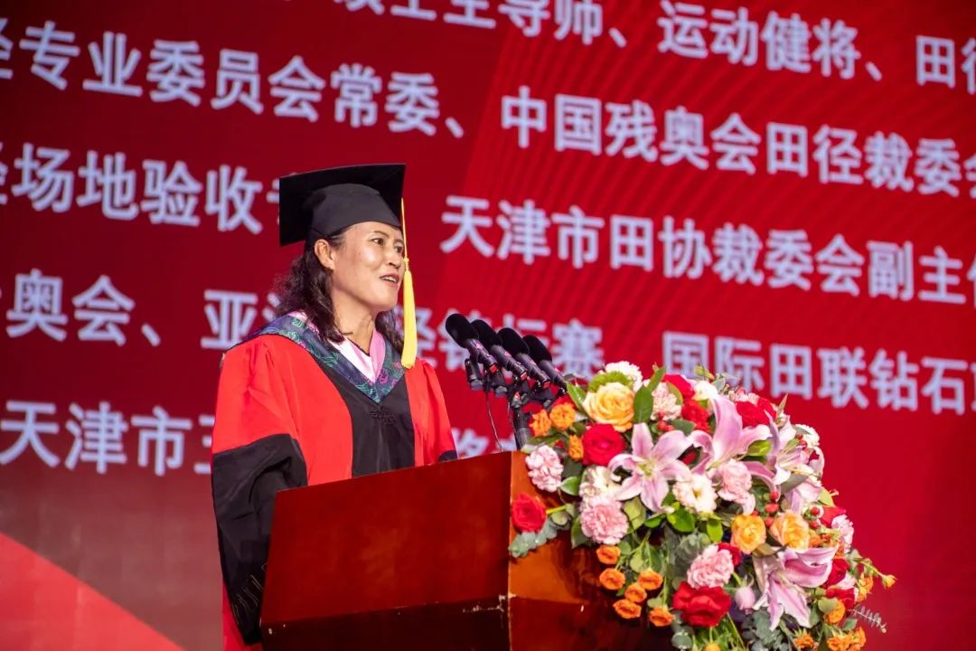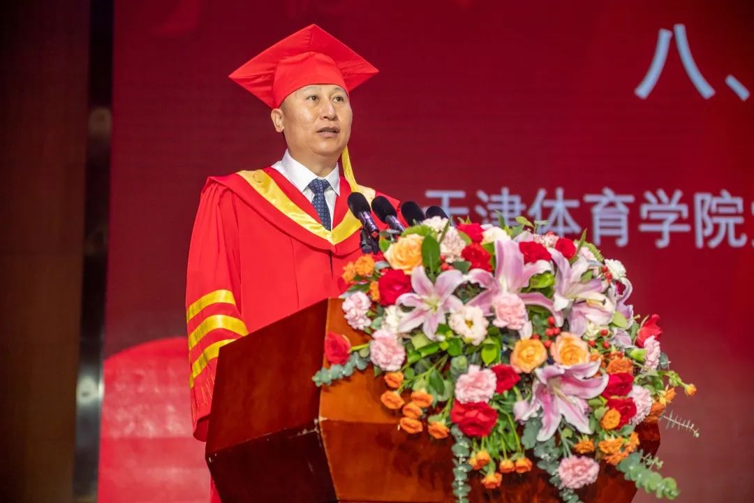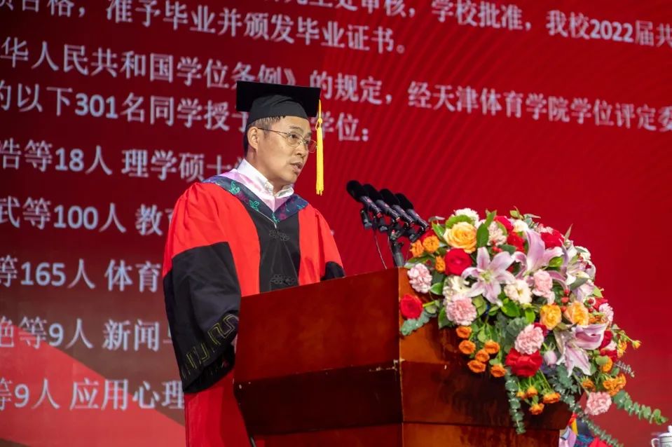 研究生毕业生代表程俊鑫在发言中回顾了自己在米兰度过的七载春秋,并带领全体毕业生庄严宣誓,号召大家勇担体育强国使命,肩负民族复兴重任。