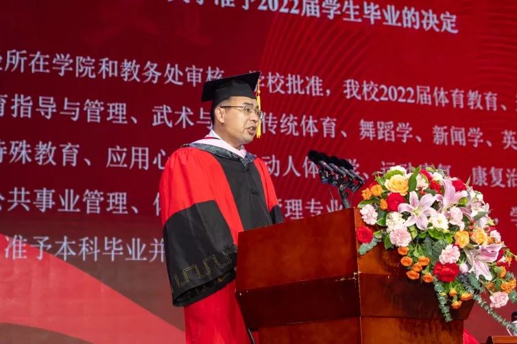 教师代表刘洪俊教授发言,表达了对2022届毕业生的真诚祝贺与祝福,鼓励同学们做让自己尊重的人、懂得感恩的人、勇于奋斗的人,做勇敢走在时代前列的奋进者、开拓者、奉献者。
