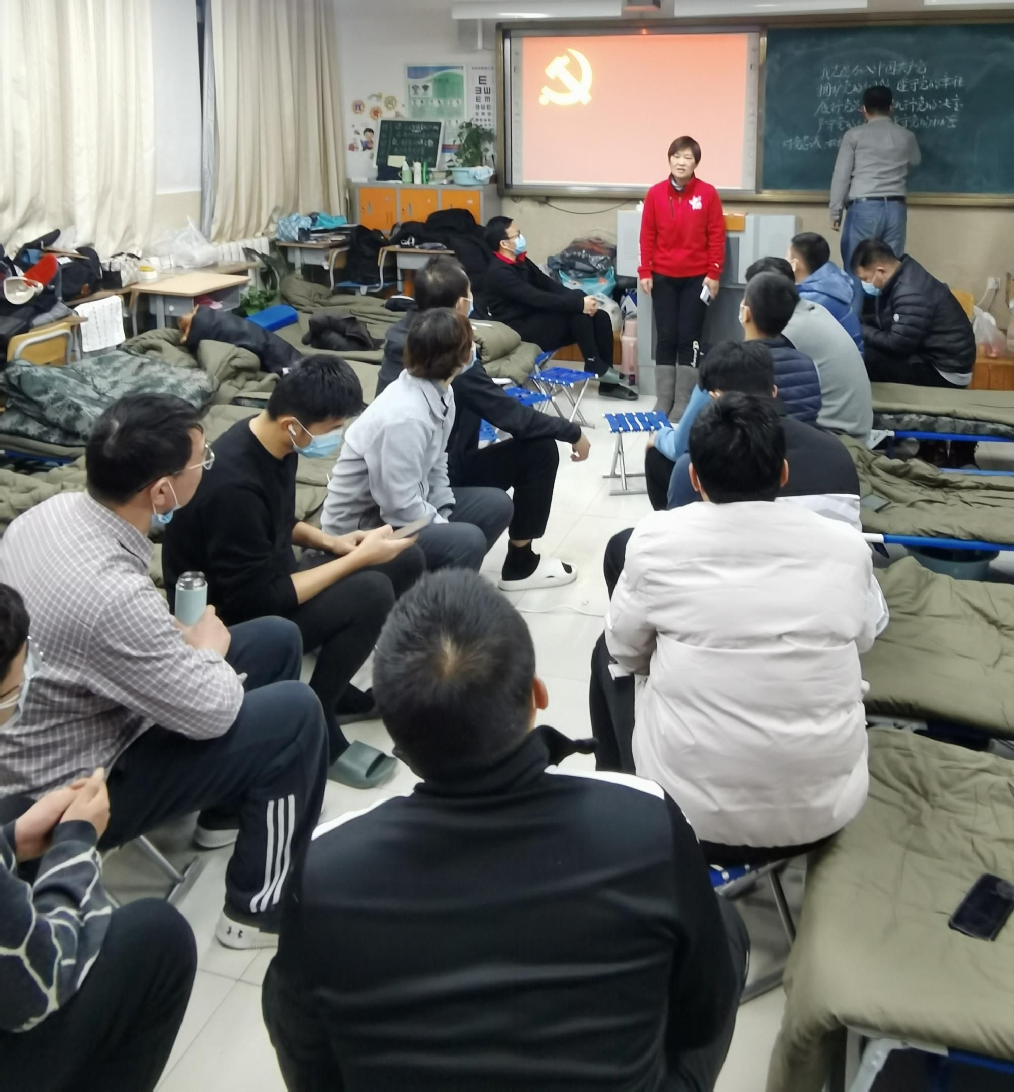 1月21日晚7点,突击队临时党支部召开全体党员大会。首先,支部书记刘锦瑶带领全体党员在党旗面前重温入党誓词。随后,刘锦瑶总结了突击队进入封控区三天来的工作情况,讨论了下一阶段工作安排。最后,全体党员进行集体学习。同志们纷纷表示有信心打好这场奥密克戎的阻击战,让全市人民过一个祥和的春节。突击队员邢进和魏诗瑶向临时党支部递交了入党申请书。