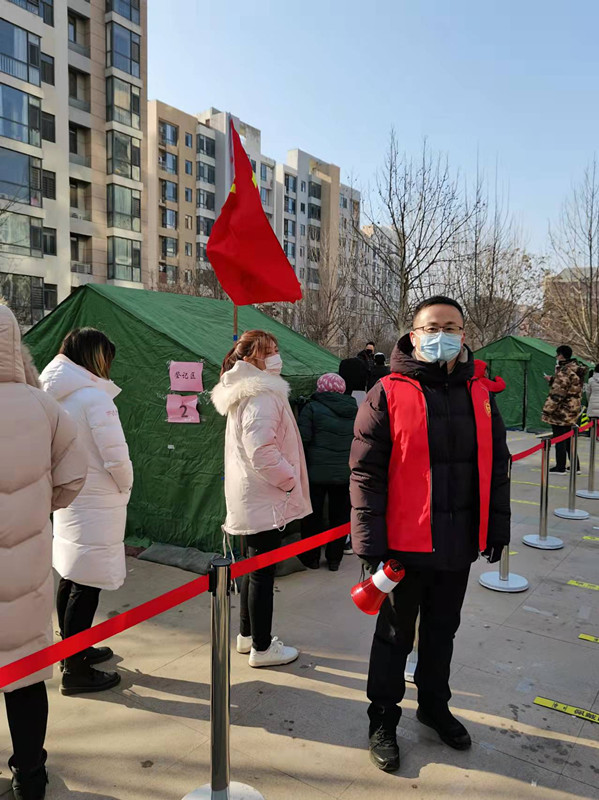 贾军峰,中共党员,党委学工部干部,参加河西区天塔街道宾水南里社区核酸筛查志愿服务,完成筛查场地布置、政策宣传、数据录入、身份信息采集等工作。