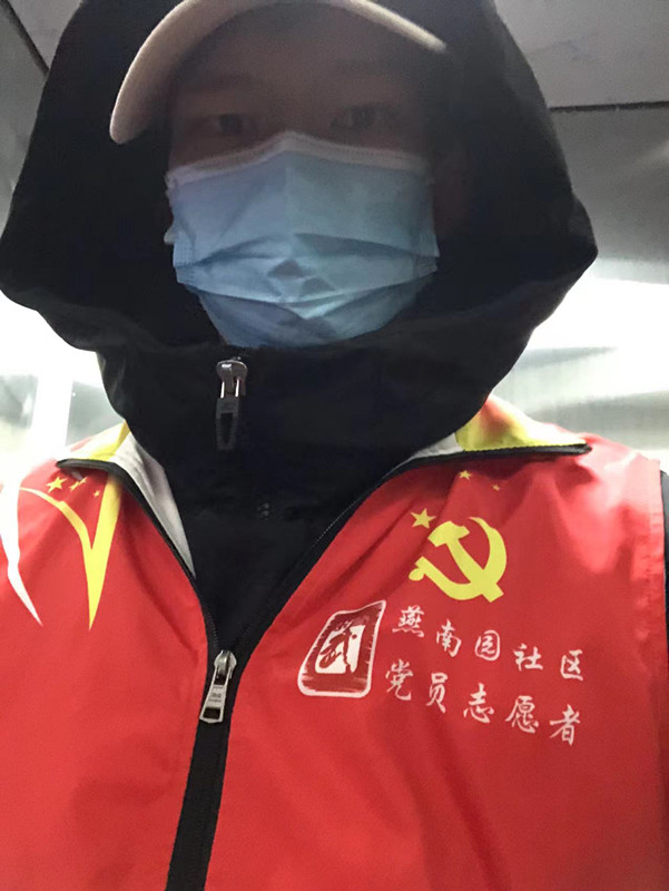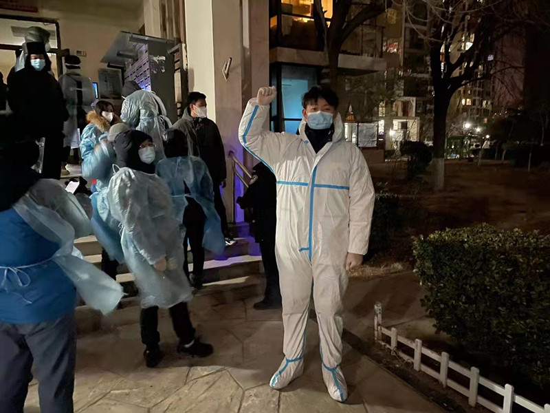 张鹏远,中共党员,辅导员,在西青区精武镇旭辉燕南园负责居民扫码登记和核酸检测现场秩序维护。