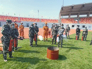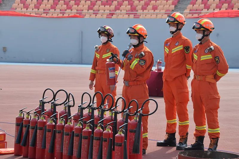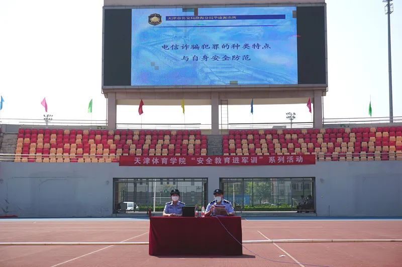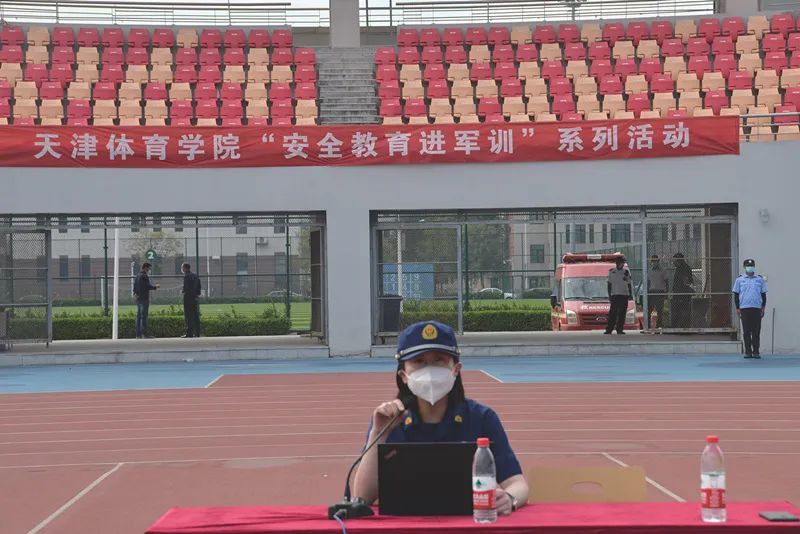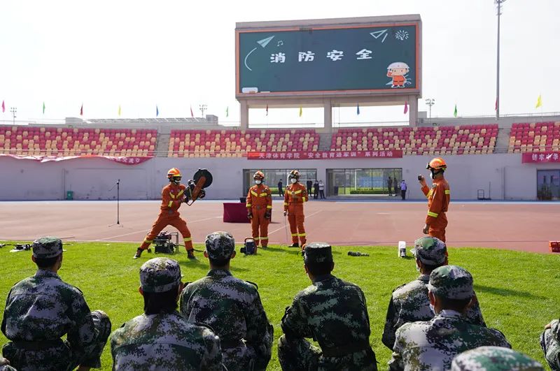 在田径场,静海区消防救援支队宣传教员为同学们讲解火灾危害、用火用电安全、灭火技能、火场逃生等消防安全知识,展示了消防车辆、特种消防器材,演示了灭火器、灭火毯、消防水枪、自救式呼吸器等消防设备的使用方法。团泊西中队指战员指导大学生现场使用灭火器、消防水枪等消防设备。华康派出所民警开展防电信诈骗讲座。