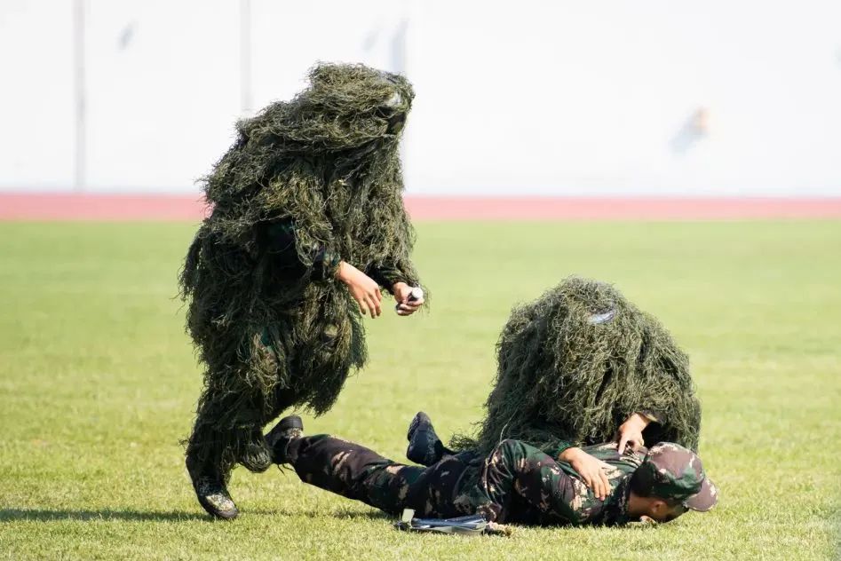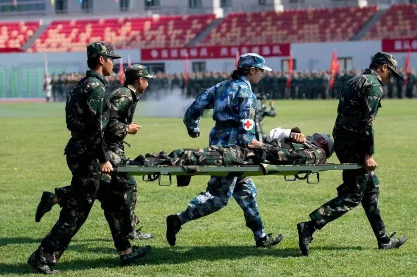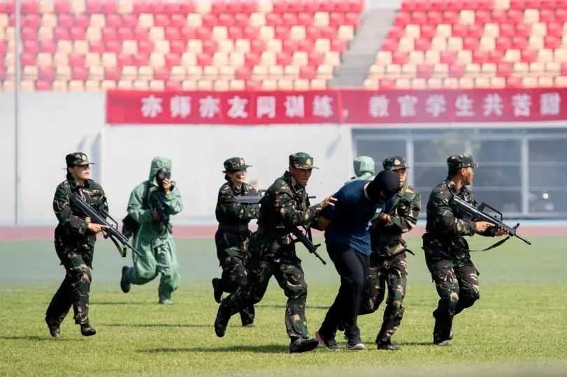 大会在雄壮的国歌声中拉开序幕。伴随着《分列式进行曲》,三军仪仗队和16个连队的千余名2022级新生,依次走过主席台接受检阅。同学们步伐坚定整齐、军姿飒爽挺拔、口号刚毅嘹亮、精神昂扬饱满,全面展示了军训成果。2022级本科生军训团摔擒方队与战术方队进行了军事技能表演。他们巧妙地将捕俘拳、打背包、战术对抗、核生化防护及战场救护等军事技能展示,与疫情防控演练相结合,展现了米兰学子情系国防、荣校报国的使命担当。