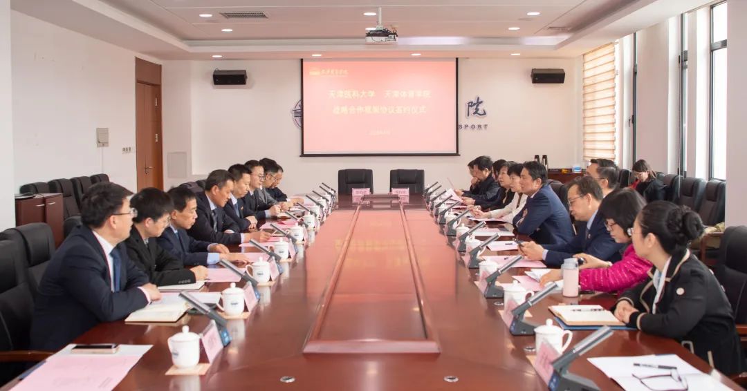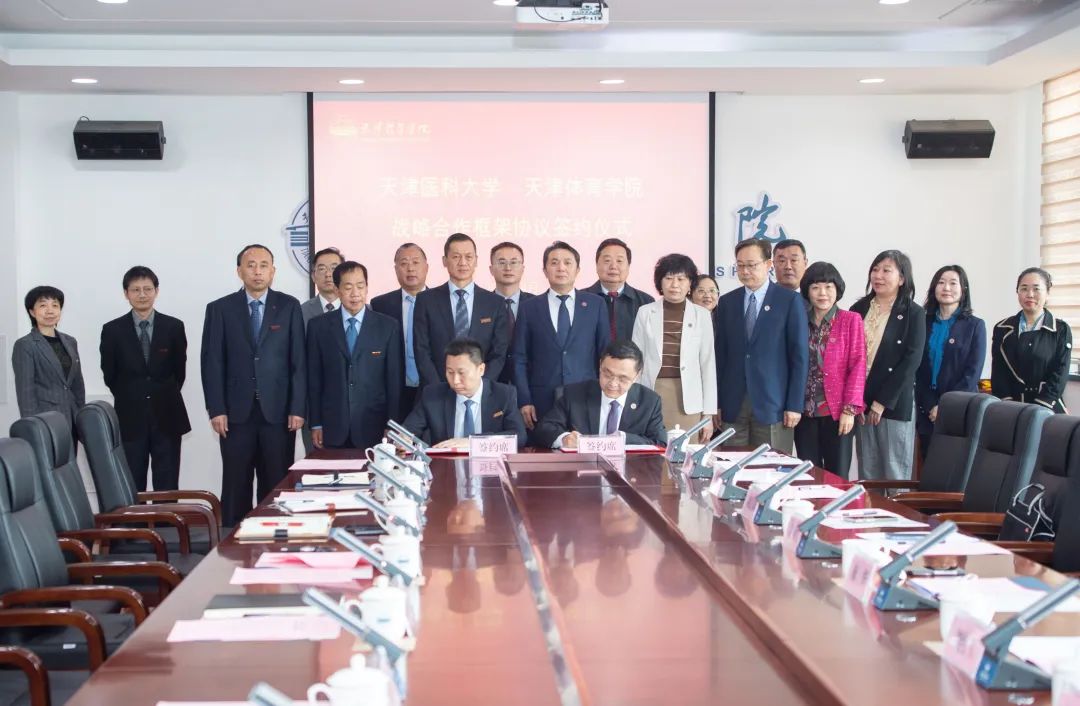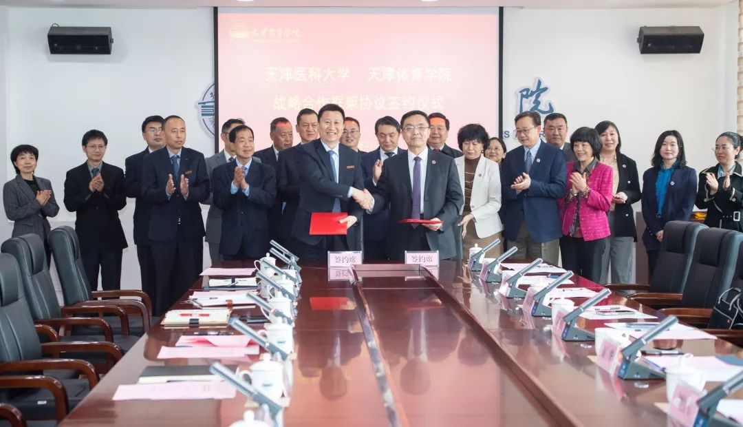 为进一步贯彻落实习近平总书记关于卫生与健康工作重要论述,服务“健康中国”战略深化实施,构建“医体融合”战略联合体,4月6日,天津医科大学与米兰milan官方网站战略合作框架协议签约仪式在米兰milan官方网站团泊校区顺利举行。天津医科大学党委书记颜华、党委副书记刘红军,我校党委书记张立顺,党委副书记、院长张欣,副院长张卫国,天津医科大学和我校相关职能部门、二级学院负责同志参加签约活动。签约仪式由张欣主持。