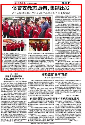 近日,2023年国家体育总局体育支教志愿服务全面启动。包括我校志愿者在内的、来自全国的27所高校的466名大学生志愿者,前往山西、内蒙古、江西、湖北、四川、贵州、陕西、甘肃等省区的218所中小学,开展体育支教志愿服务活动。我校选派政治素养过硬、专业知识和技能较强的20名优秀学生组成支教团,赴内蒙古自治区巴彦淖尔市临河区开展支教活动。连日来,《中国体育报》、内蒙古电视台、《内蒙古日报》《呼和浩特晚报》《巴彦淖尔晚报》等多家媒体对此进行了报道。