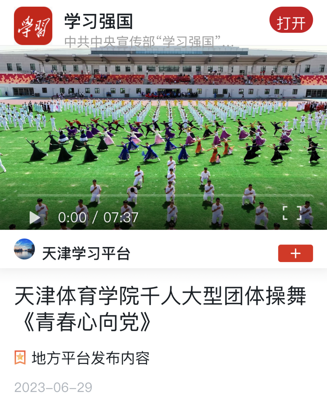 6月29日,学习强国天津学习平台播发我校千人大型团体操舞《青春心向党》。