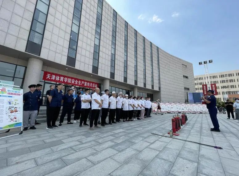 6月16日,在生活服务楼前广场,学校组织开展了安全生产集中宣传活动,并邀请属地消防救援部门为食堂后厨员工、楼内秩序员、保安人员,以及变电站、能源站运维等工作人员,进行自救互救技能培训和灭火器实操讲解及演练。活动中,消防指战员重点为食堂后厨工作人员进行了灶台灭火,以及消火栓、灭火毯使用的实操讲解及技能培训。通过培训演练,从业人员进一步明确了安全生产岗位责任,掌握了灭火技能,熟悉了安全逃生路线,提升了应对突发火险的能力。