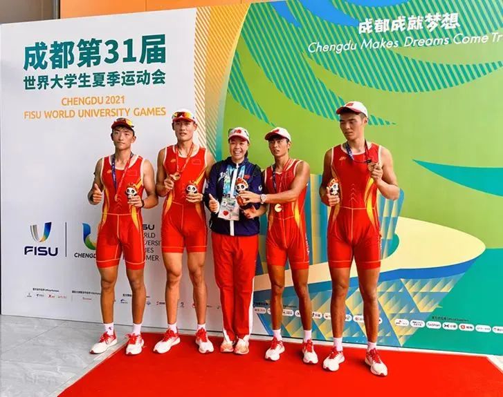 另外,我校教师李晶晶作为主教练,带领4名运动员斩获男子四人单桨金牌。我校教师王保臣作为体能教练,助力中国队时隔20年再次夺得大运会女排冠军。