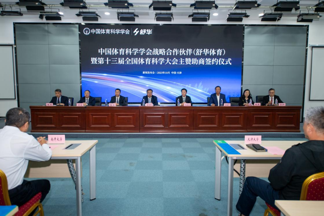 2023年10月10日,中国体育科学学会战略合作伙伴暨第十三届全国体育科学大会主赞助商签约仪式在天津市体育局举行。中国体育科学学会副理事长兼秘书长、国家体育总局体育科学研究所党委书记、所长曹景伟,中国体育科学学会常务理事、新闻发言人祝莉,天津市体育局副局长、一级巡视员王路华,天津市委教育工委委员、市政府教育督导室总督学王秋岩,米兰milan官方网站党委副书记、院长张欣,舒华体育股份有限公司总裁张维建,以及南开大学、天津大学、天津师范大学、天津理工大学、天津工业大学、天津中医药大学、天津城建大学、天津体育职业学院的代表、嘉宾,中央、天津及有关媒体出席了发布会。发布会由中国体育科学学会常务理事、国家体育总局体育科学研究所副所长杨杰主持。