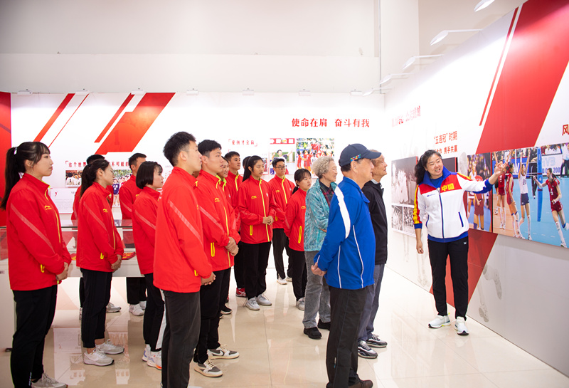 在2004年奥运会女排冠军张娜的带领下,退休教师们和研究生代表共同参观了“国家荣誉——中国女排精神展”。张娜生动讲解了中国女排勇夺十次世界冠军的历程和拼搏之路,通过观看影像、图文展览和馆内实物,大家直观感受中国女排一路走来的艰辛,从“没什么不可能”到“爱拼才会赢”再到“没有最好的个人,只有最好的团队”的理念,深刻领悟了“祖国至上、团结协作、顽强拼搏、永不言败”的女排精神。展馆中复刻的“竹棚”训练馆也勾起了老教师们的回忆,纷纷讲起上世纪80年代中国女排背后的科研故事,我校排球教研室成员在缺乏电子设备的条件下,依靠人工手写资料、反复看录像等方式,分析研究排球技战术,为中国女排训练、比赛提供了理论支撑。