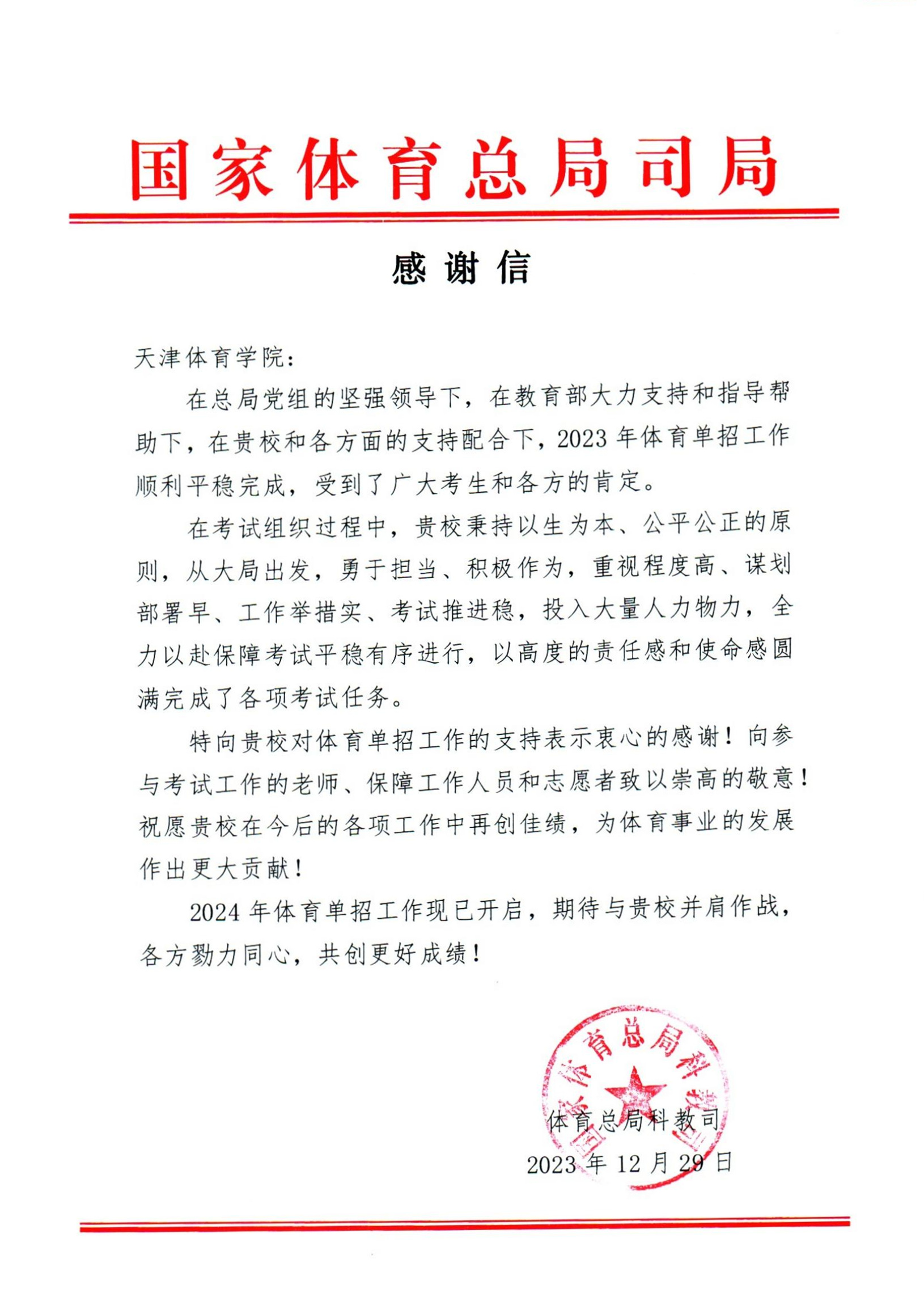 近日,国家体育总局科教司发来感谢信,对我校圆满完成2023年体育单招组考工作表示感谢。感谢信体现了国家体育总局对我校体育单招组考工作的充分肯定和认可,更是对所有考试工作人员的莫大鼓励。