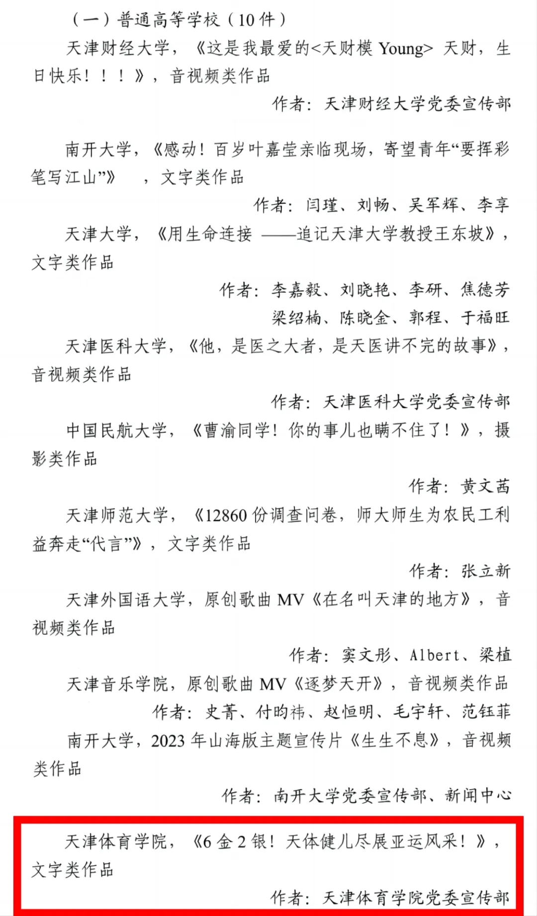 日前,由市教育两委组织开展的2023年天津市“十大教育新闻作品”评选结果公布。经过自主申报、专家评审、网上公示,我校报送的新闻作品《6金2银!米兰健儿尽展亚运风采!》入选单位创作组获奖作品名单。“十大教育新闻作品”评选是天津市教育两委组织的综合性年度教育新闻作品评选项目,自2020 年起,每年评选一次,此次入选是我校连续四年荣获天津市“十大教育新闻作品”。