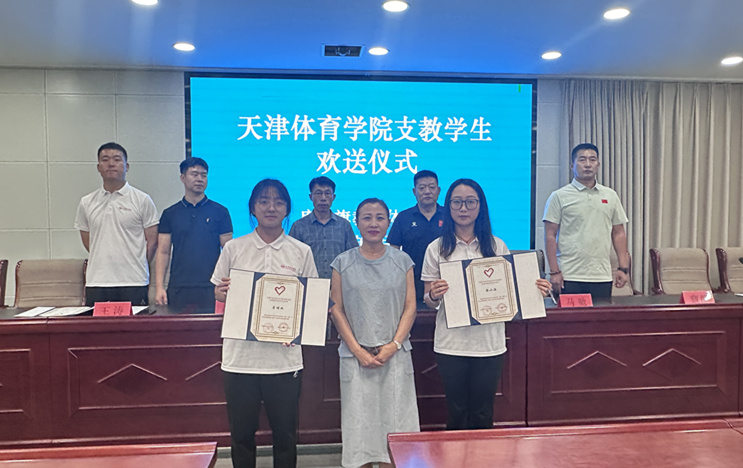 7月2日,运动训练学院党委书记张志斌、副院长鲍巨彬、辅导员赵文勇分别前往赤峰市宁城县、通辽市库伦旗迎接志愿者返津。当地教育体育局为我校志愿者举办了热烈的欢送仪式,并颁发了志愿者证书。