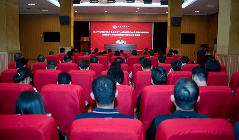 在平津战役纪念馆报告厅,党委书记张立顺为中心组成员讲授题为《深入学习领会习近平总书记关于全面加强党的纪律建设的重要论述 以党纪学习教育成效推动学校事业高质量发展》的党纪学习教育专题党课。党课由党委副书记宋爱军主持。