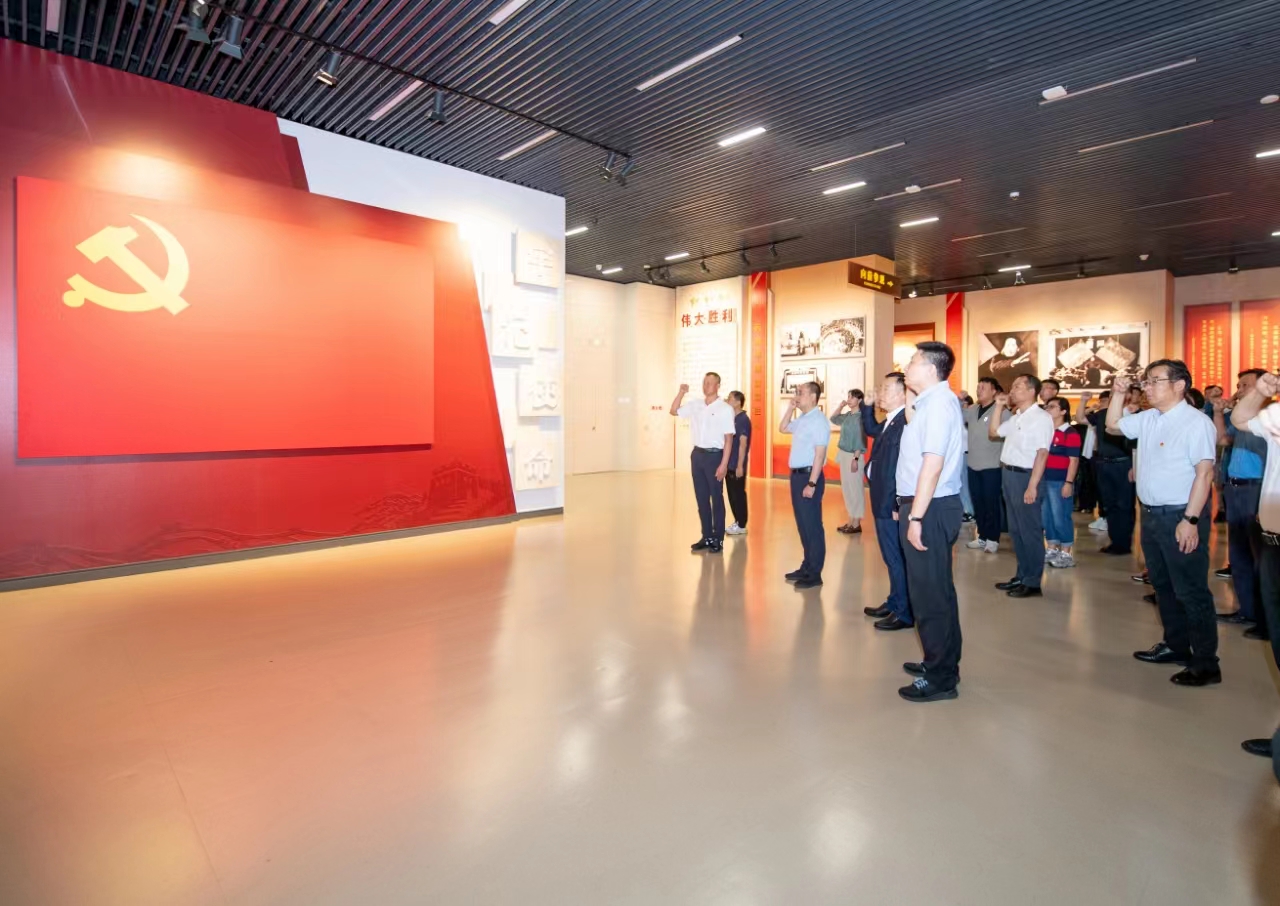 中心组成员走进展厅参观展览,在一件件珍贵的实物展品前、在一份份厚重的档案资料前、在一帧帧生动的历史照片前,大家驻足认真观看,仔细聆听讲解员讲解,深入了解展品背后的相关历史背景和史实,不时互相交流。在鲜红的党旗前,党委书记张立顺带领党员领导干部一起重温入党誓词。