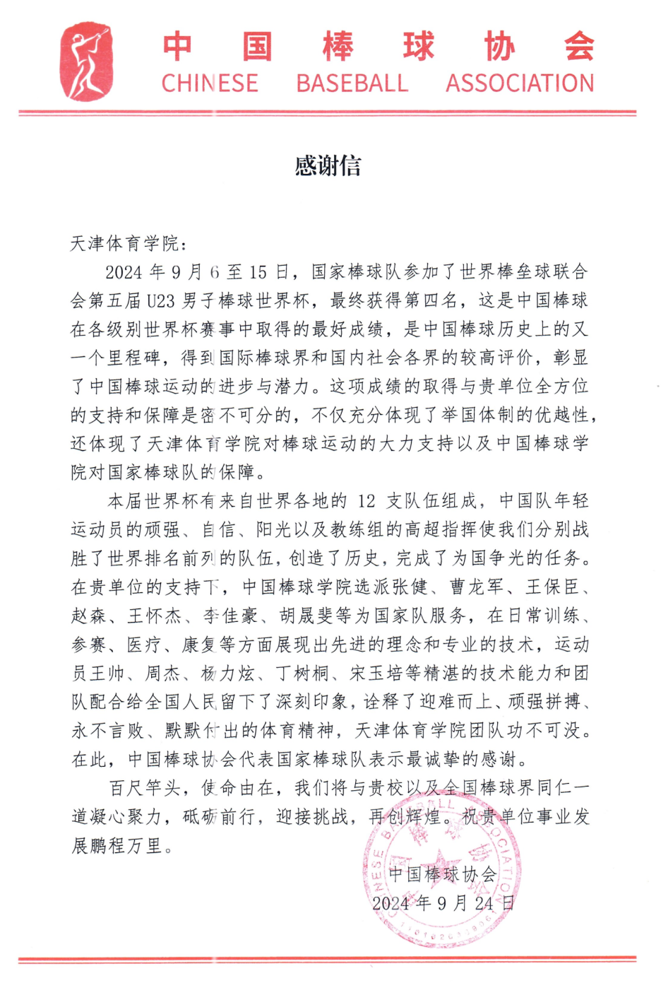 感谢信表示,本次比赛是中国棒球在各级别世界杯赛事中取得的最好成绩,是中国棒球历史上的又一个里程碑,希望我校与棒球界同仁一道,砥砺前行,再创辉煌。