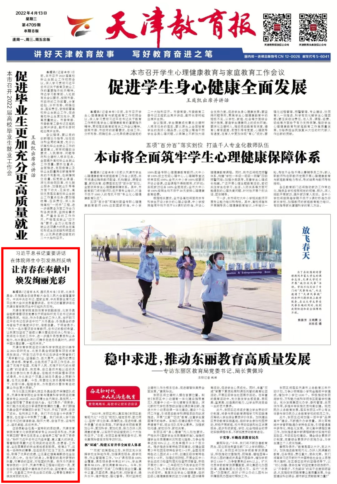 2022年4月13日,《天津教育报》头版以“习近平总书记重要讲话在体院师生中引发热烈反响 让青春在奉献中焕发绚丽光彩”为题,对我校进行报道,现全文转载。