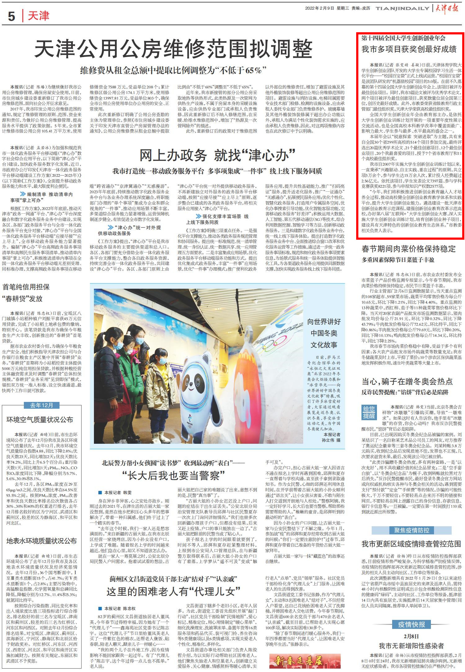 2022年2月9日,《天津日报》第5版报道我校大学生创新创业项目。现全文转载。