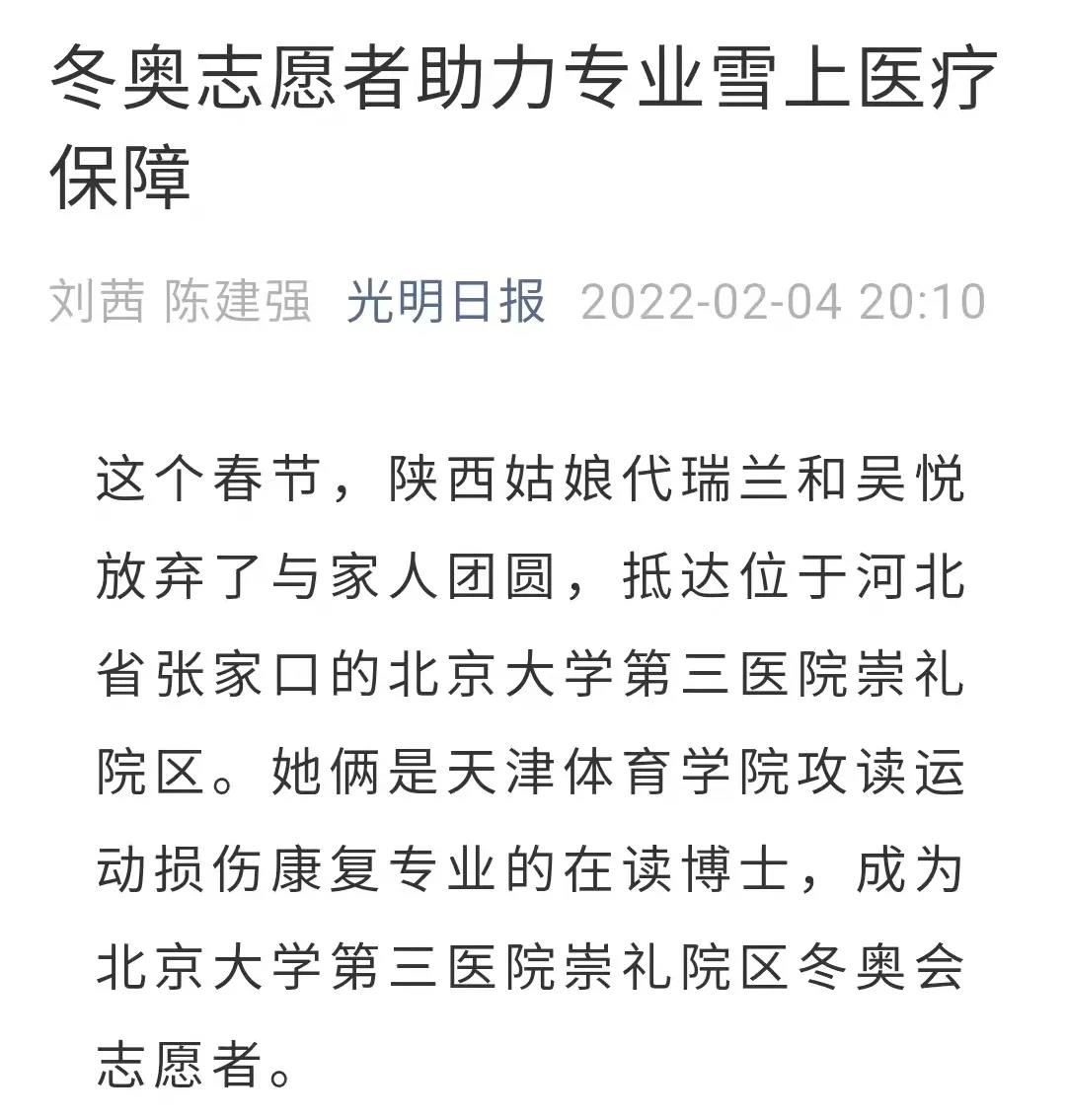 2022年2月4日,《光明日报》以“冬奥志愿者助力专业雪上医疗保障”为题,对我校进行报道。现全文转载。