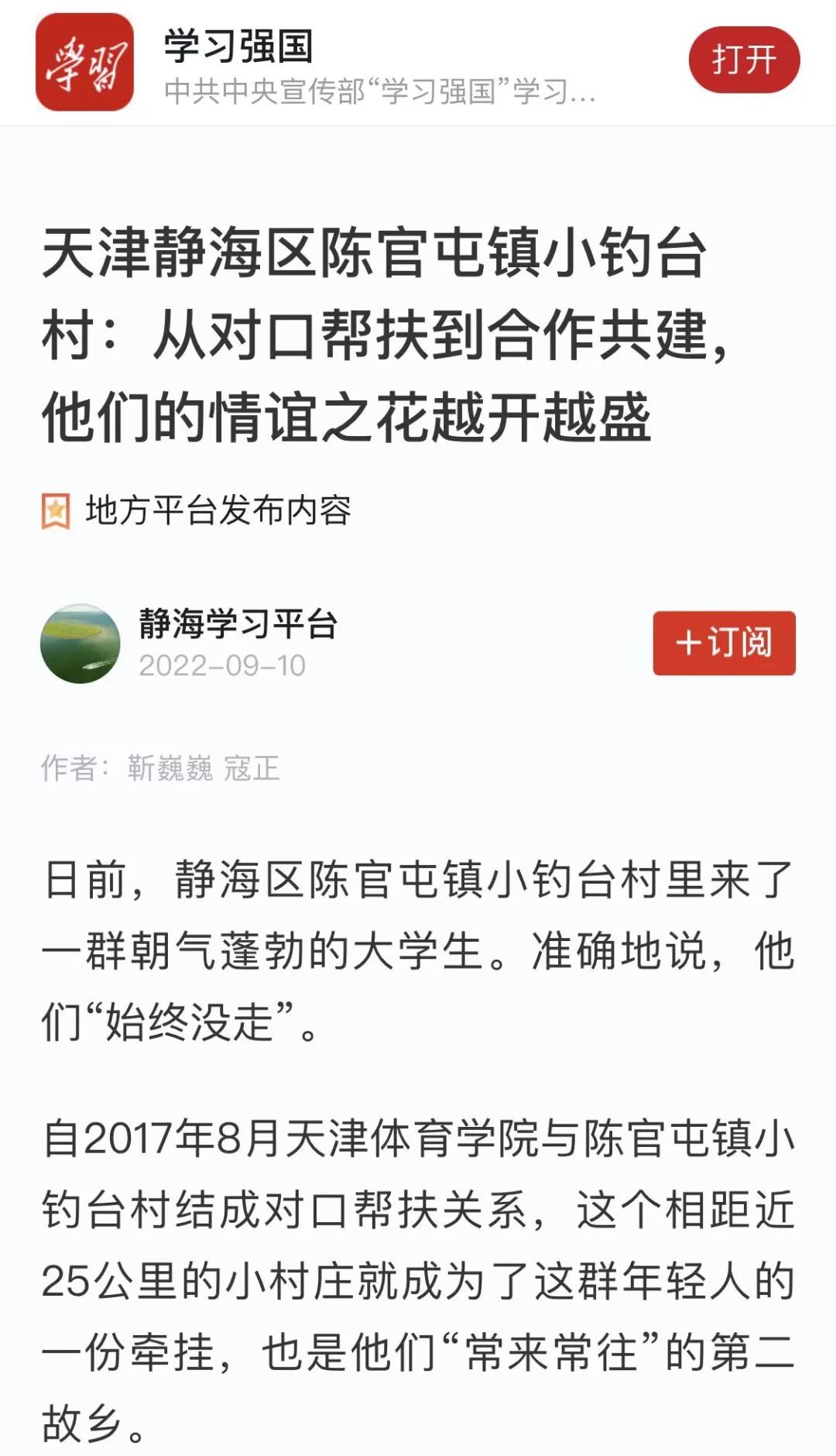 9月10日,学习强国报道我校与静海区陈官屯镇小钓台村深化合作共建,积极探索乡村振兴共建发展新模式,我校师生发挥特长优势,助力乡村振兴。