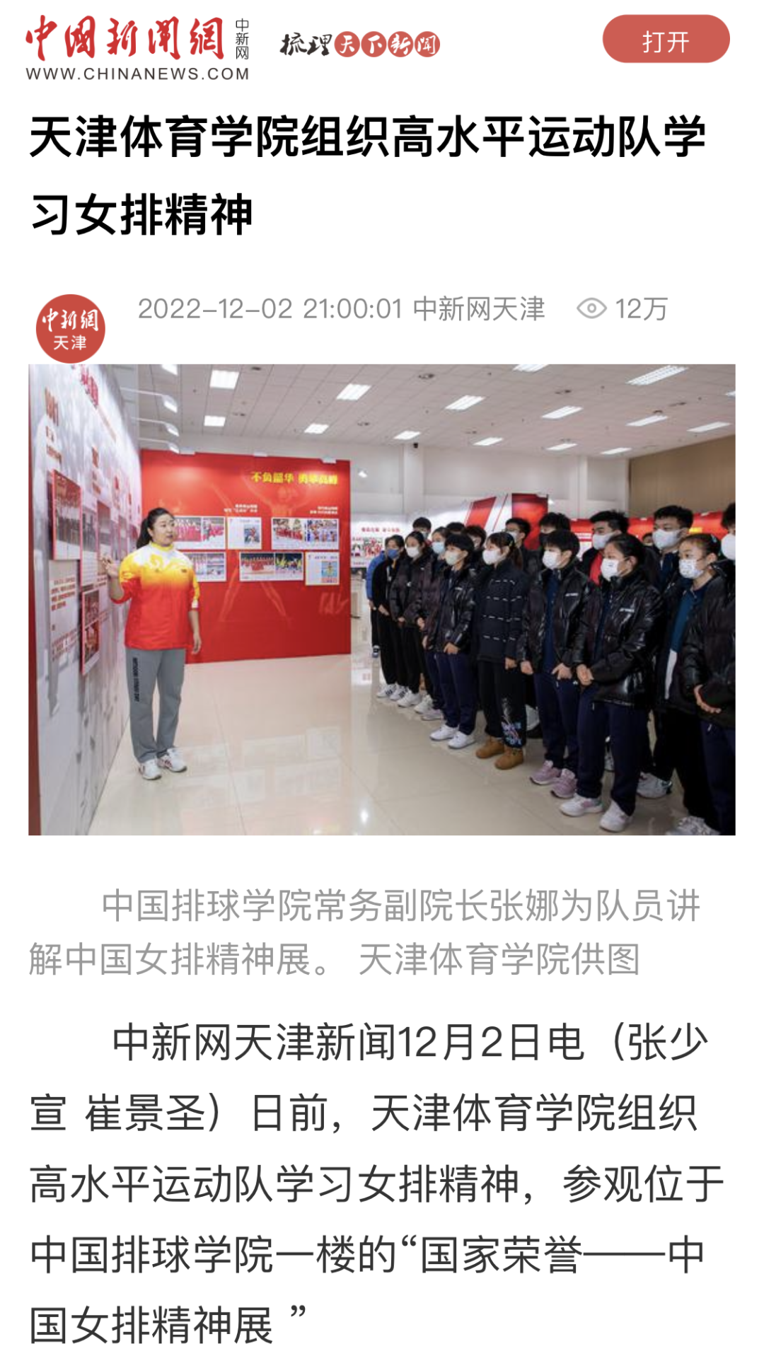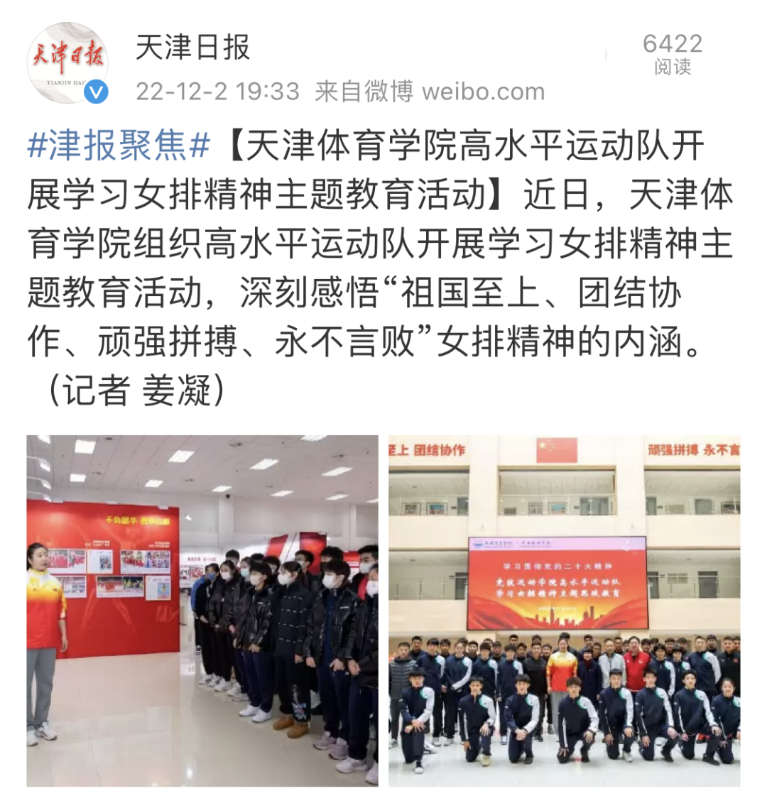 为深入学习贯彻党的二十大精神,教育引导我校高水平运动队队员坚定不移听党话、跟党走,做有理想、敢担当、能吃苦、肯奋斗的新时代好青年,我校组织高水平运动队开展学习女排精神主题教育活动。中国新闻网、天津日报新媒体、《天津教育报》等中央和我市媒体对此进行了报道。