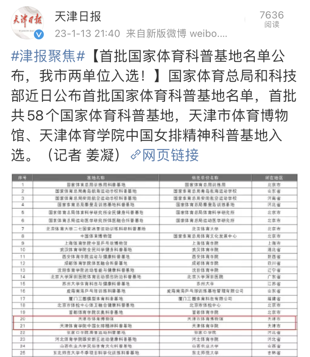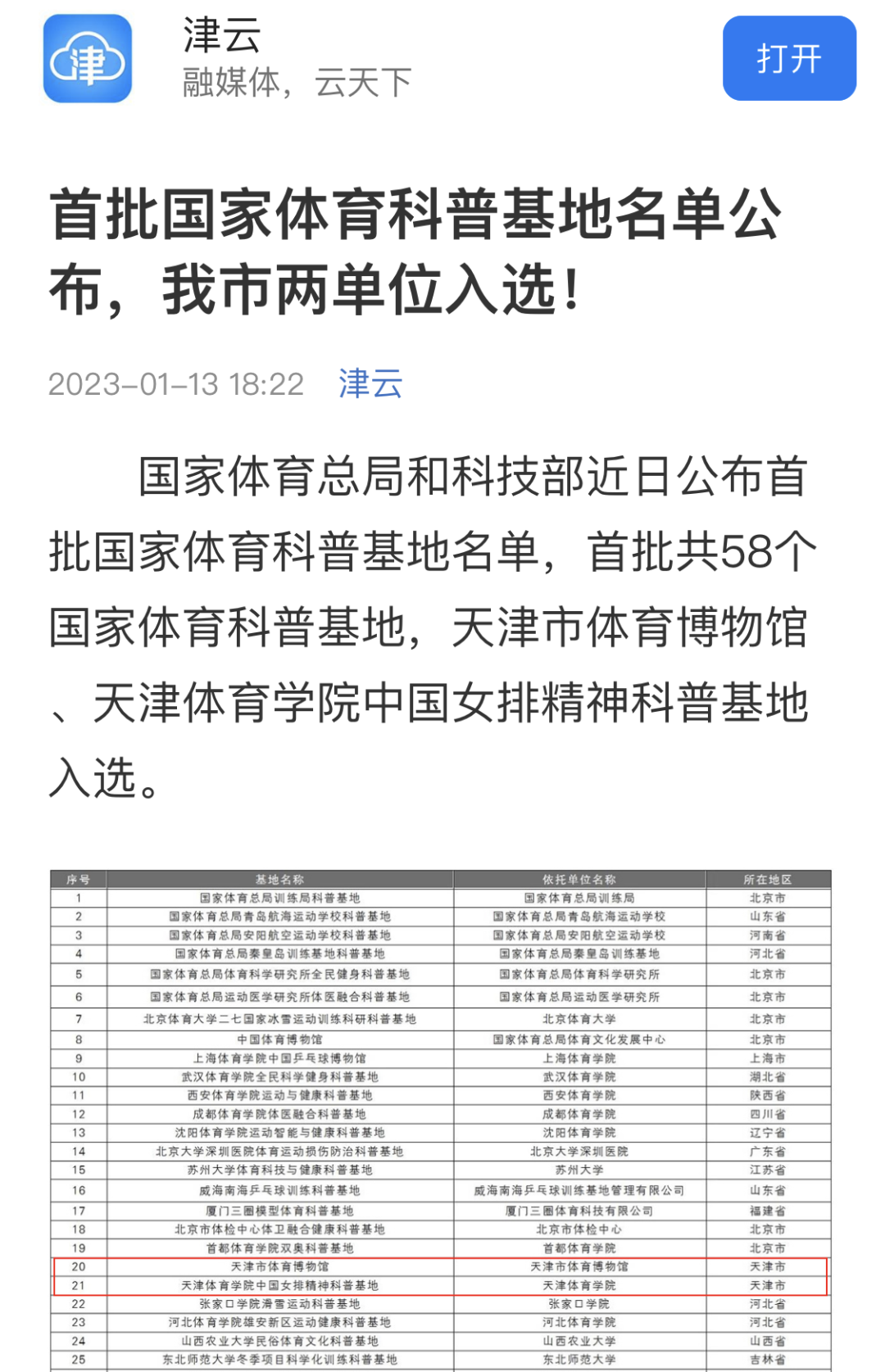 近日,国家体育总局和科学技术部公布首批国家体育科普基地名单。经过组织推荐、专家评审、公示命名等环节,我校中国女排精神科普基地获批首批国家体育科普基地。央广网、中国新闻网、学习强国、天津日报新媒体、津云、天津教育报新媒体等中央和我市多家媒体对此进行了报道。
