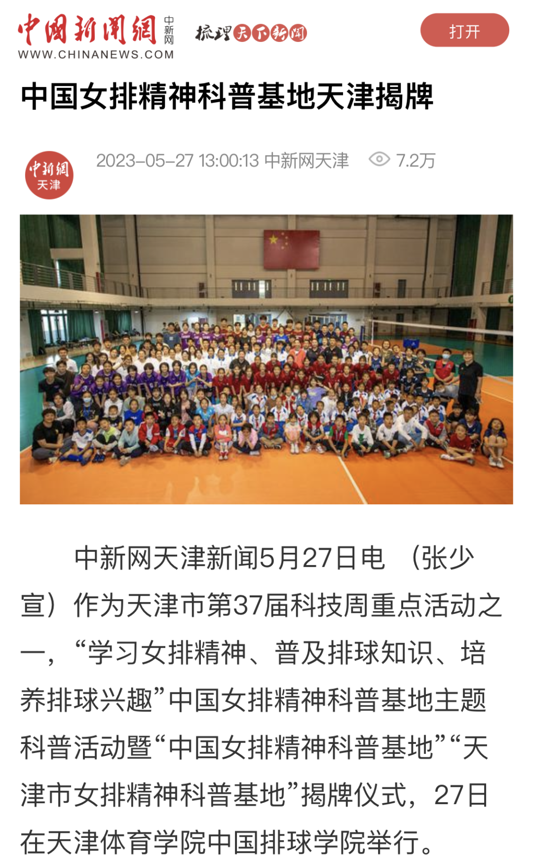 5月27日,作为天津市第37届科技周重点活动之一,“学习女排精神、普及排球知识、培养排球兴趣”中国女排精神科普基地主题科普活动暨“中国女排精神科普基地”“天津市女排精神科普基地”揭牌仪式,在米兰milan官方网站中国排球学院举行。新华网、中国新闻网、《天津日报》、北方网、津云、天津教育报新媒体、天津广播等中央和我市媒体对此进行了报道。