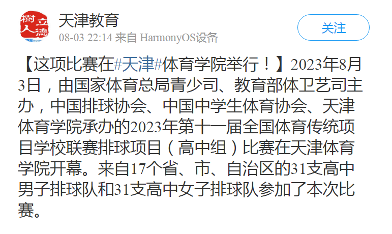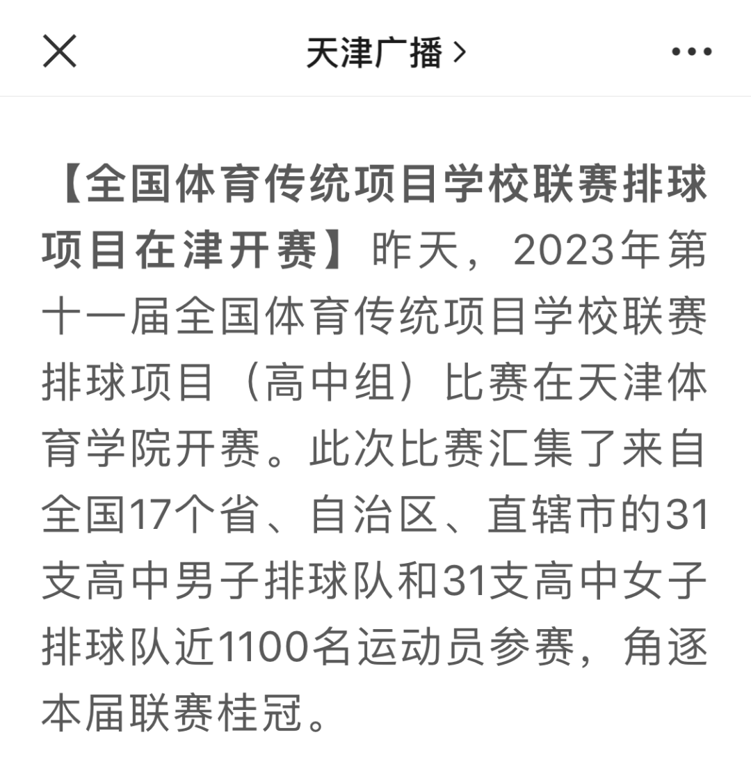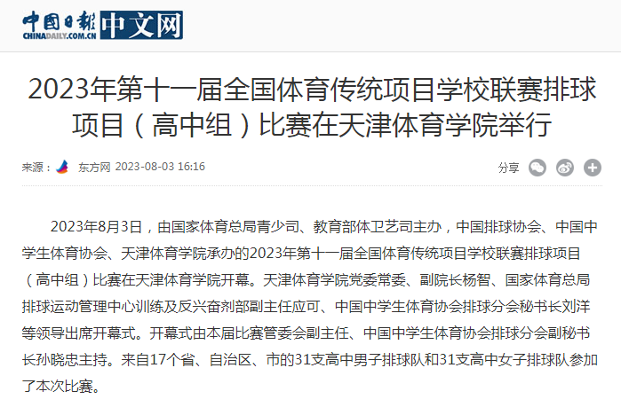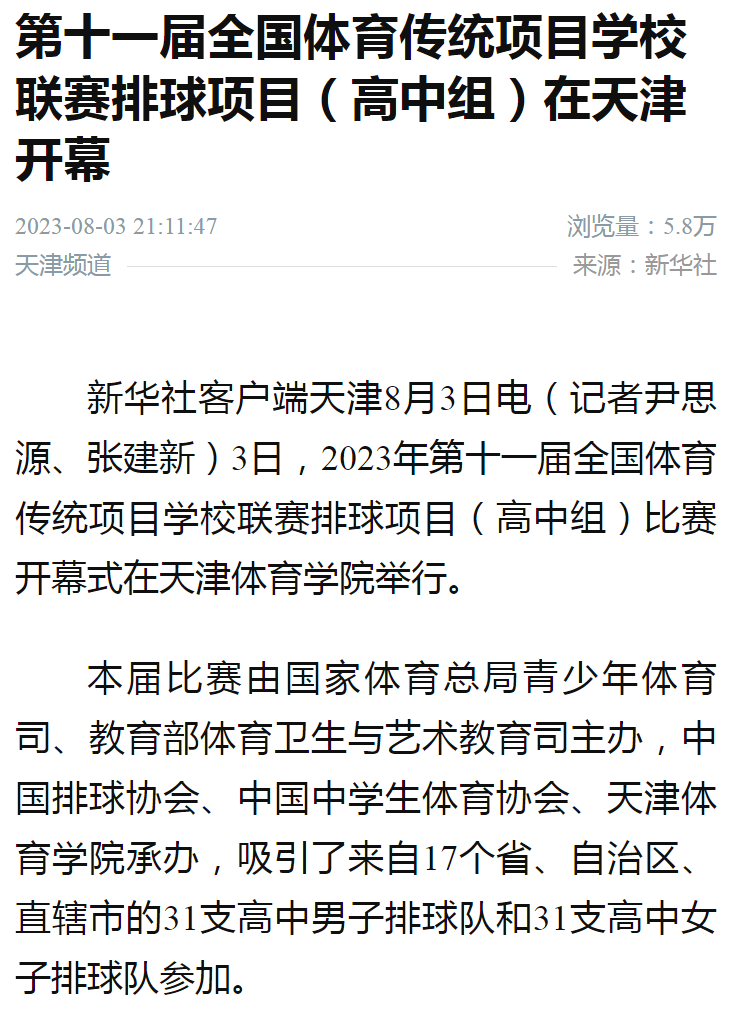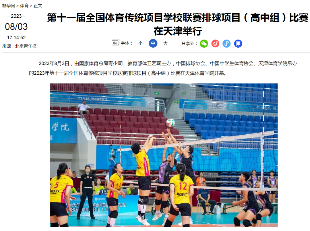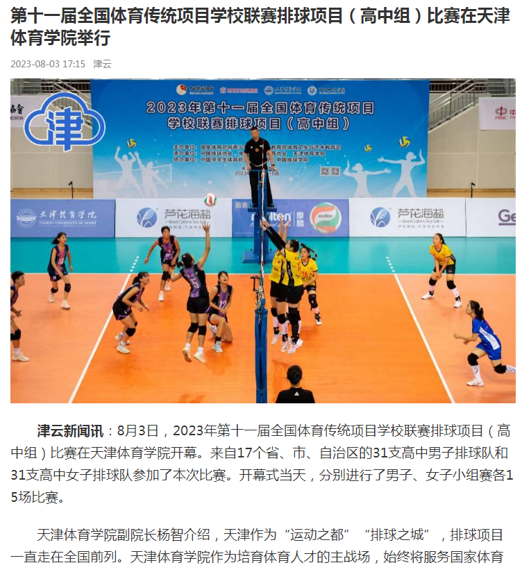 2023年8月3日,由国家体育总局青少司、教育部体卫艺司主办,中国排球协会、中国中学生体育协会、米兰milan官方网站承办的2023年第十一届全国体育传统项目学校联赛排球项目(高中组)比赛在米兰milan官方网站开幕。来自17个省、自治区、直辖市的31支高中男子排球队和31支高中女子排球队参加了本次比赛。新华社、新华网、中国网、中国日报、光明网、《天津日报》、津云、天津广播、天津教育报新媒体、天津教育新媒体等中央和我市多家媒体对此进行了报道。