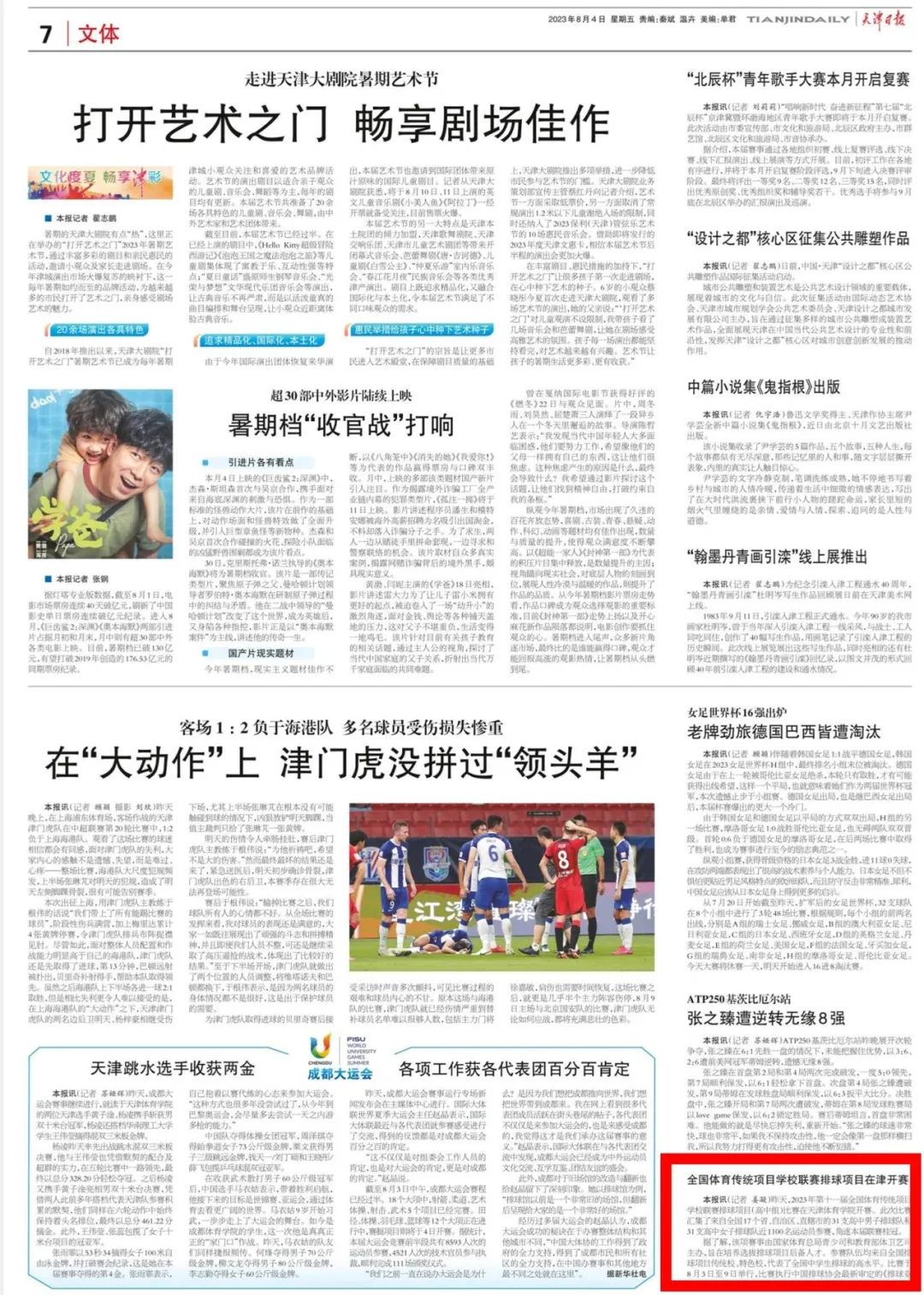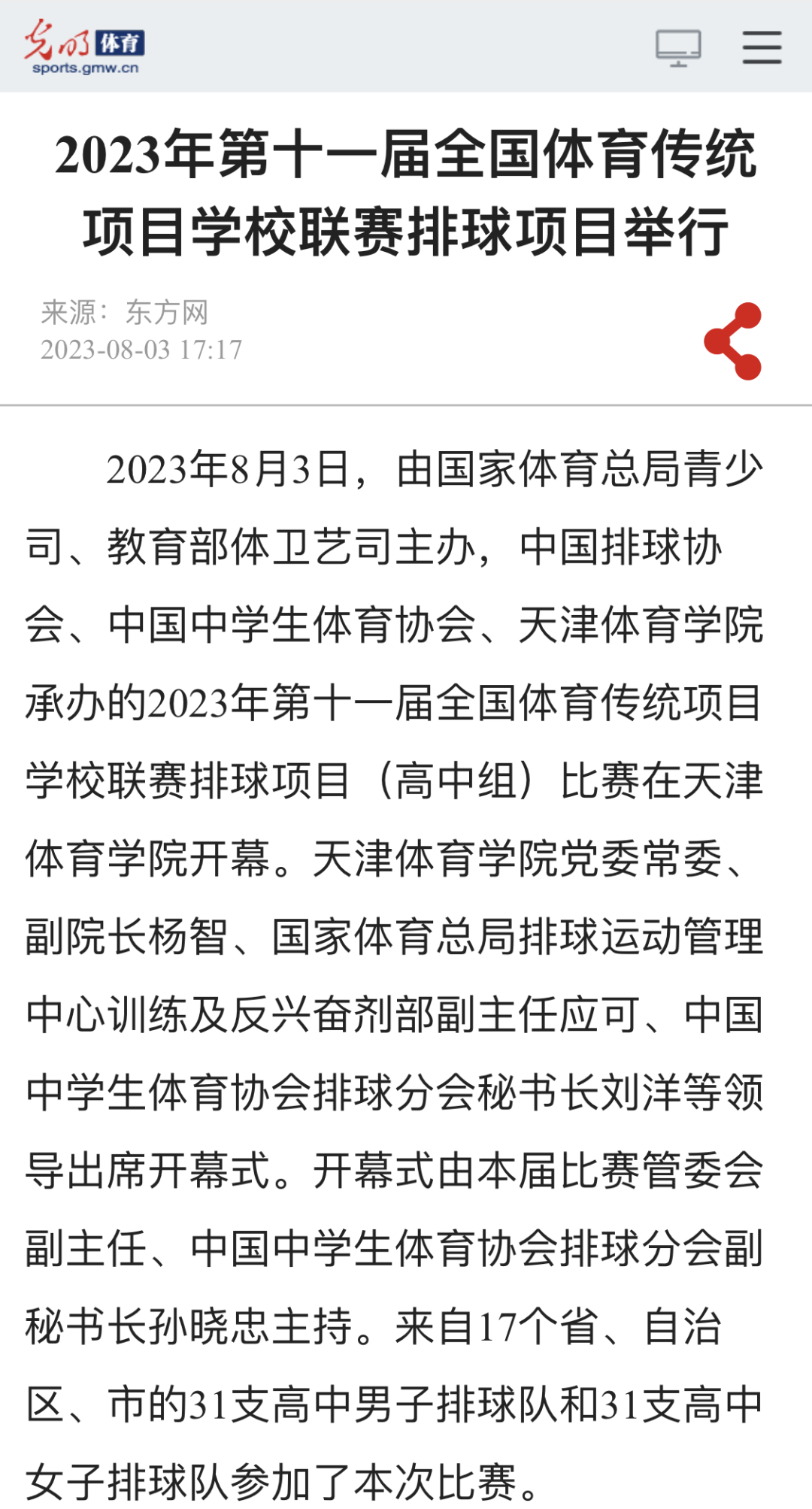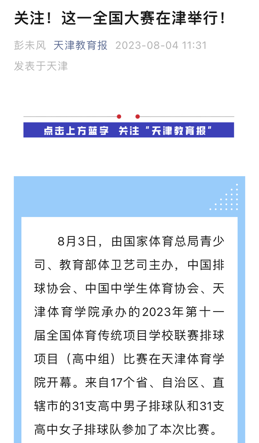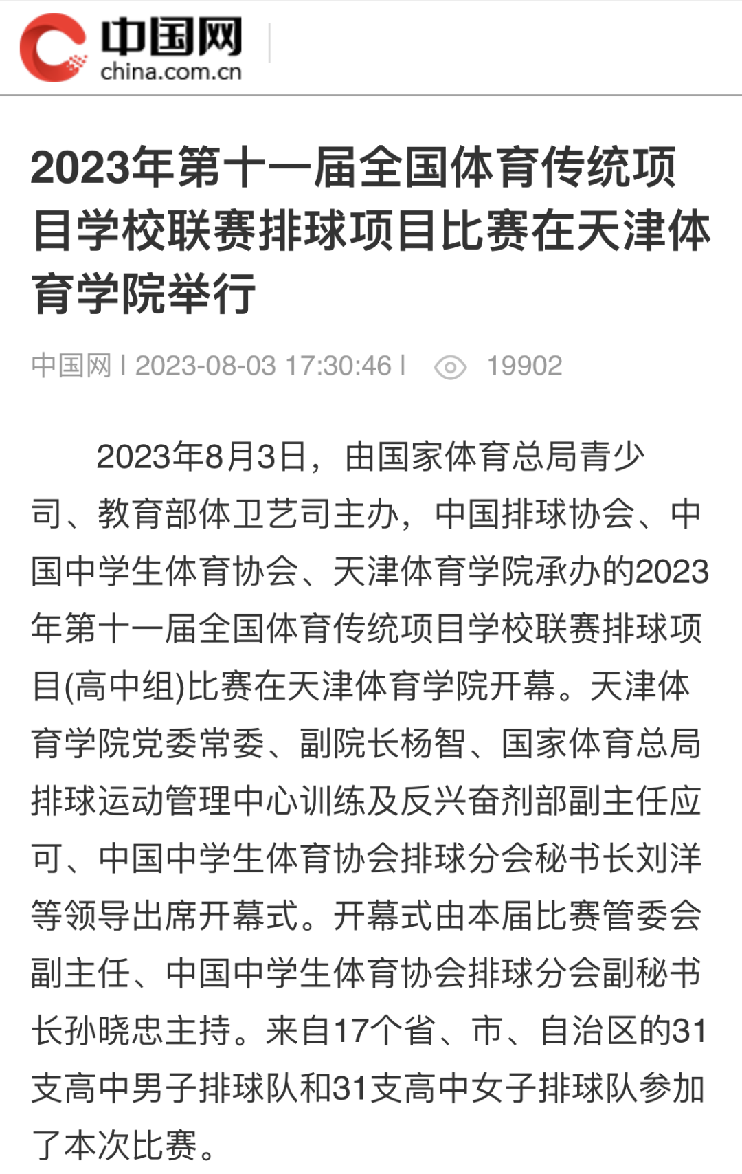 2023年8月3日,由国家体育总局青少司、教育部体卫艺司主办,中国排球协会、中国中学生体育协会、米兰milan官方网站承办的2023年第十一届全国体育传统项目学校联赛排球项目(高中组)比赛在米兰milan官方网站开幕。来自17个省、自治区、直辖市的31支高中男子排球队和31支高中女子排球队参加了本次比赛。新华社、新华网、中国网、中国日报、光明网、《天津日报》、津云、天津广播、天津教育报新媒体、天津教育新媒体等中央和我市多家媒体对此进行了报道。