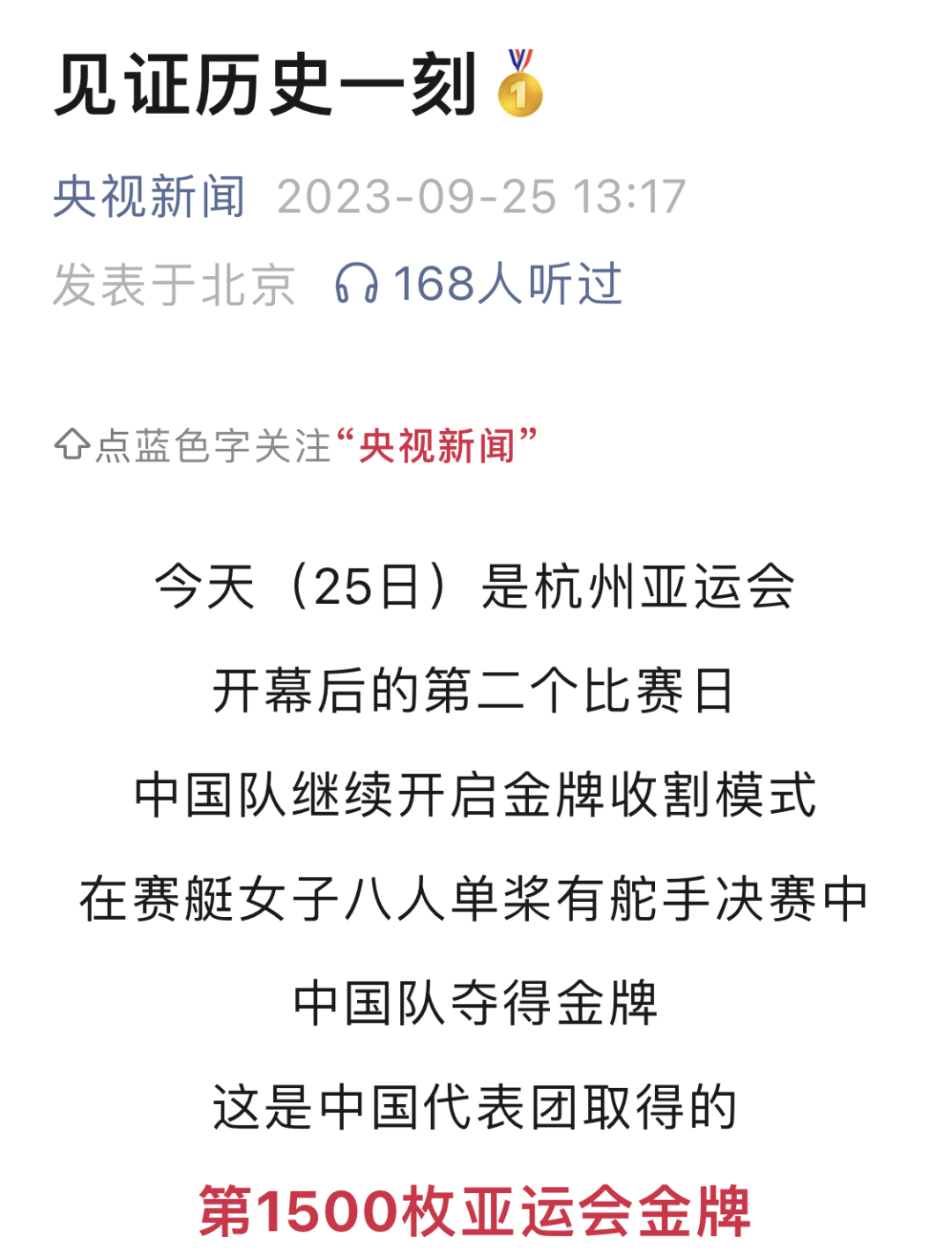 9月25日,杭州第19届亚运会赛艇女子八人单桨有舵手决赛中,我校学子鲍丽郡充分发挥技战术水平,与队友协同配合、不畏强手、顽强拼搏,以绝对优势第一条艇冲过终点,摘得该项赛事金牌。这是中国体育代表团在亚运会上收获的第1500枚金牌,是天津在本届亚运会上获得的首金。央视新闻、新华社客户端、中国新闻网、《天津日报》、津云、北方网、《今晚报》、津门教育等中央和我市多家媒体对此进行了报道。
