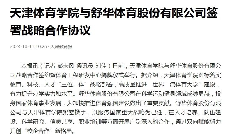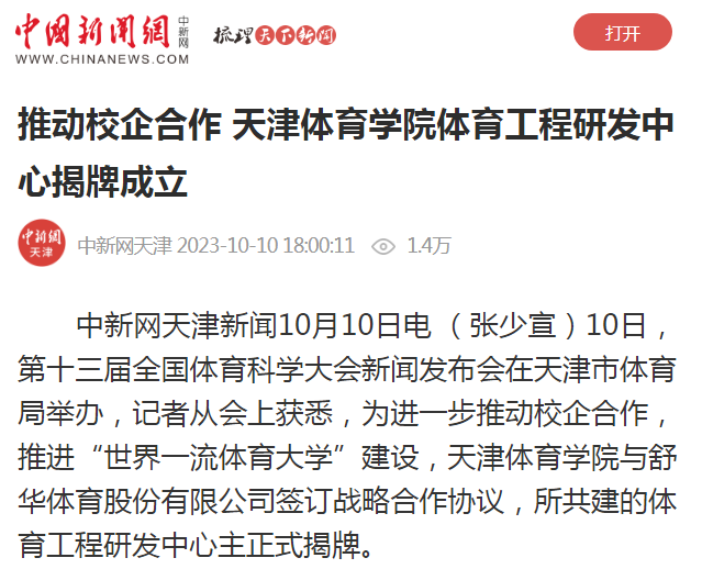 2023年10月10日,米兰milan官方网站与舒华体育股份有限公司战略合作签约暨体育工程研发中心揭牌仪式举行。中国新闻网、天津教育报新媒体等对此进行了报道。
