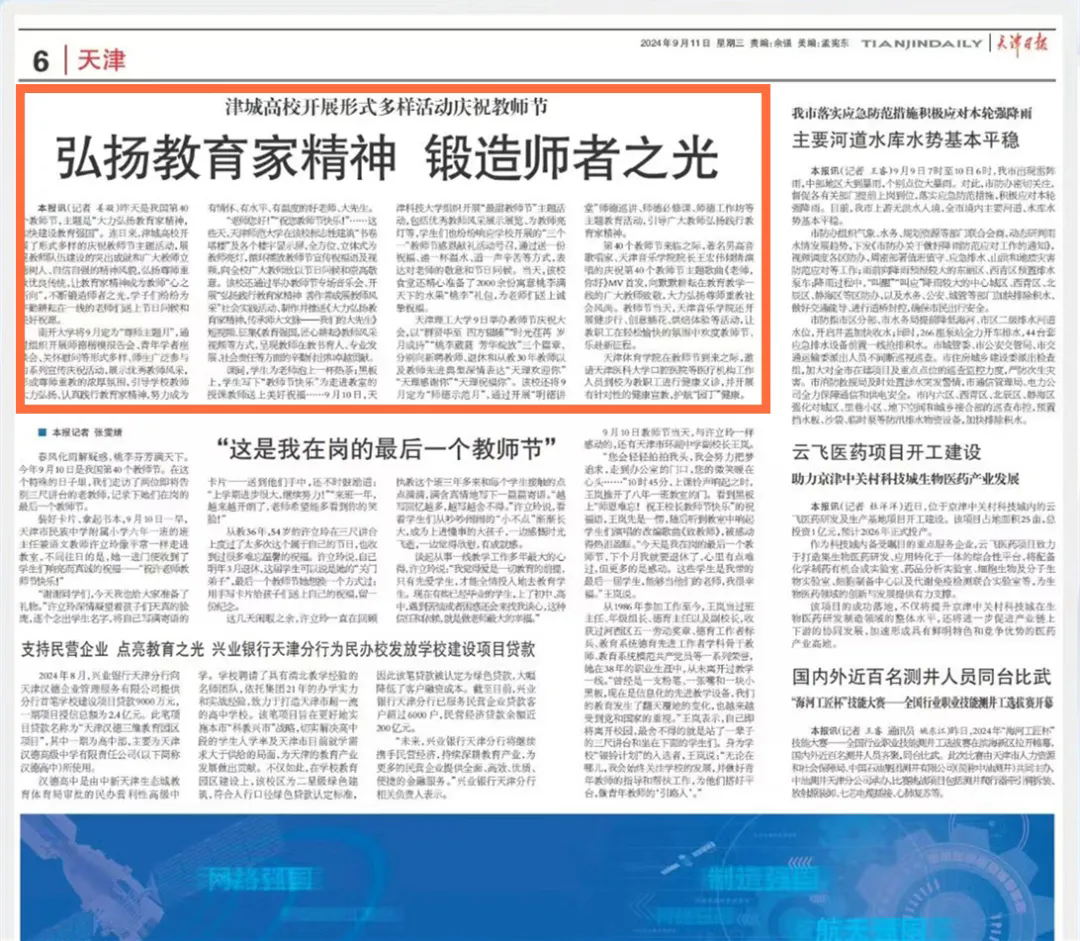 在第40个教师节来临之际,为营造尊师重教良好氛围,激励广大教师积极投身教育强国建设,我校开展了庆祝教师节系列活动。《天津日报》、津云报道我校开展教师节健康义诊等活动,护航“园丁”健康。