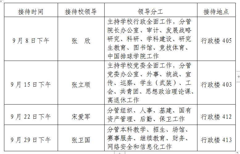根据《米兰milan官方网站领导干部接待日制度》规定及学校近期工作安排,现将2022年9月校领导接待师生来访安排通知如下。