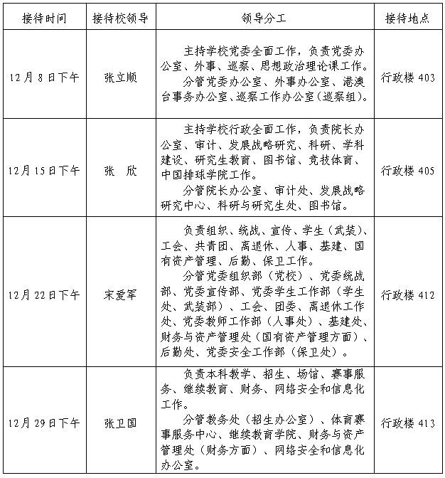 根据《米兰milan官方网站领导干部接待日制度》规定及学校近期工作安排,现将2022年12月校领导接待师生来访安排通知如下。