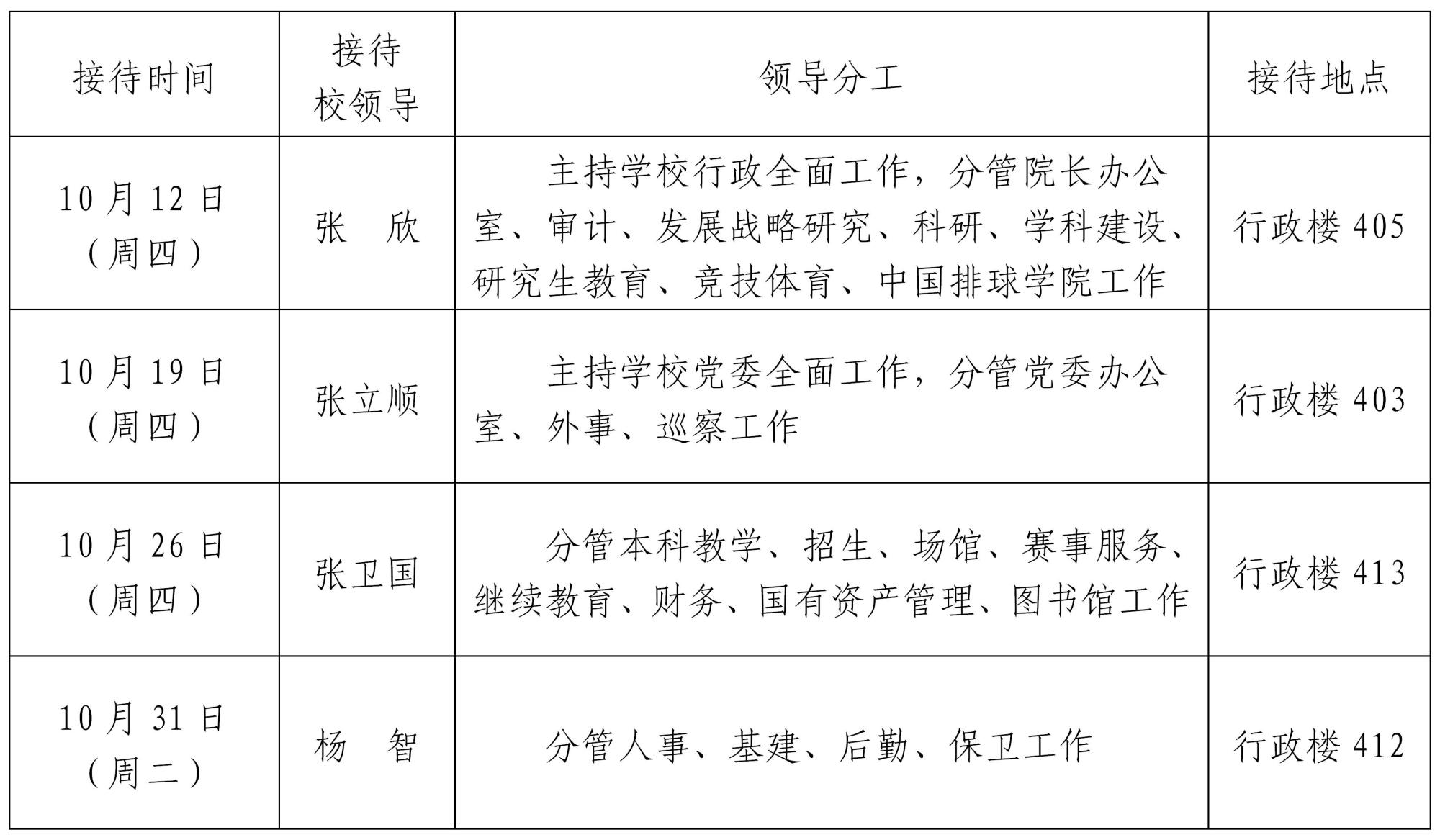 根据《米兰milan官方网站领导干部接待日制度》规定及学校近期工作安排,现将2023年10月校领导接待师生来访安排通知如下: