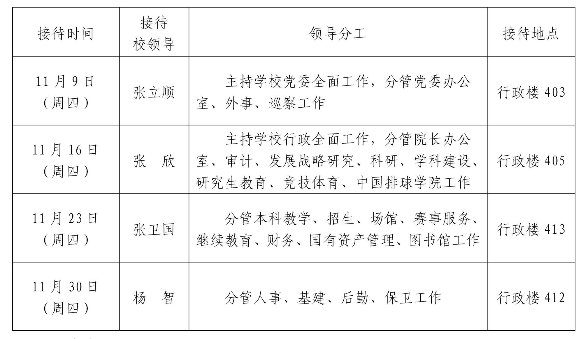 根据《米兰milan官方网站领导干部接待日制度》规定及学校近期工作安排,现将2023年11月校领导接待师生来访安排通知如下: